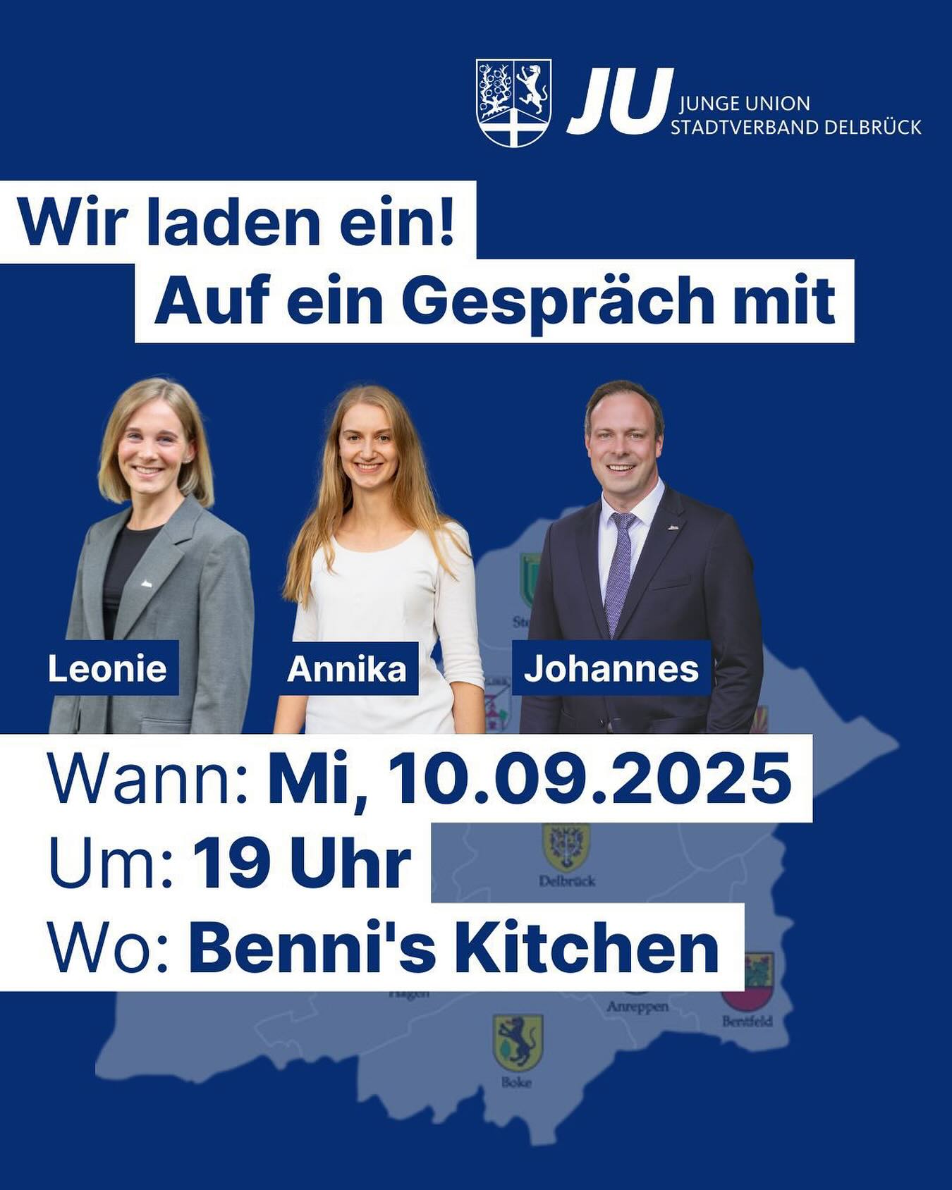 mehrWir laden euch herzlich zum Gespräch mit dem CDU-Bürgermeisterkandidaten und den JUlern ein, die für den Rat kandidieren. 🗓️ Mittwoch, 10.9. um 19 Uhr 📍 Benni?s Kitchen in Delbrück-Mitte Kommt vorbei und lernt alle drei persönlich kennen 😊 #ju #jungeunion #delbrück #delbrueck #zeitfürjungeköpfe #julerindenrat